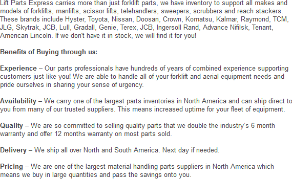 All our lift truck parts are obtainable at the best prices. Give us a call today if you are interested in getting a price quote on our attachments or parts. Our number is: